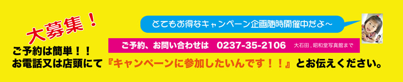 | 詳細&お知らせ | 撮影体験は毎月3組 お電話または店頭にてご予約お願いいたします ※ 撮影体験モデルは当館初めてのご利用のお客様に限ります。 |