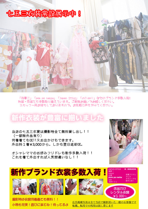 当店の衣装は女性スタッフが厳選したカワイイオシャレなモノばかりを取り揃えております。スタジオ内での撮影時は衣装はすべて無料!!お気に入りの衣装を見つけてね♥