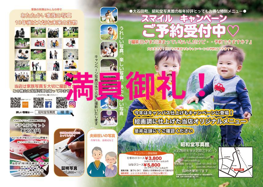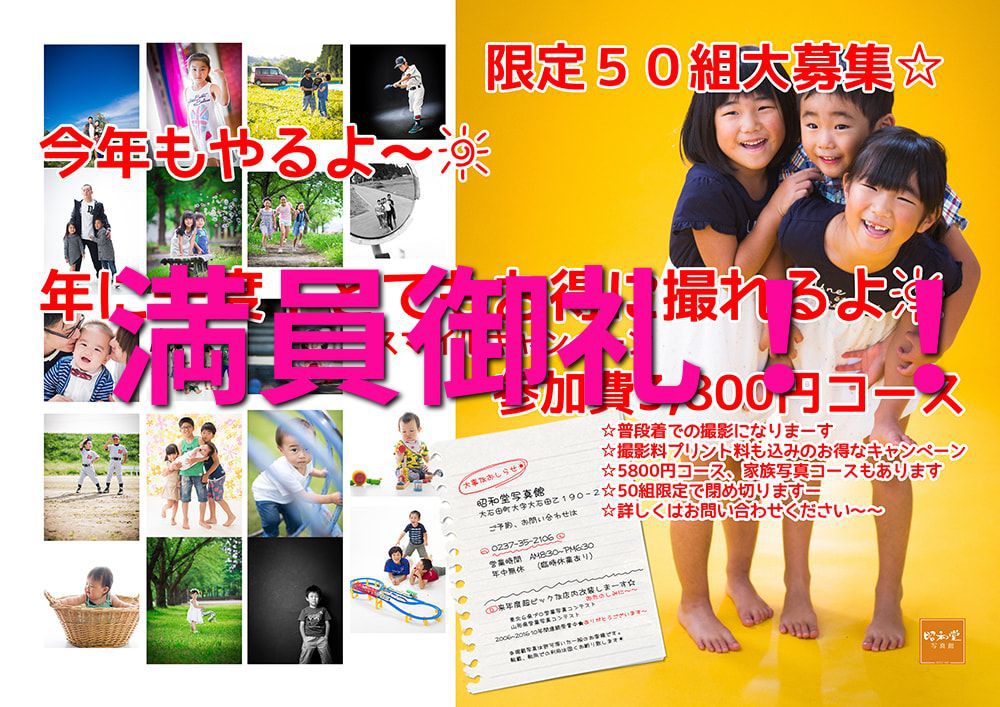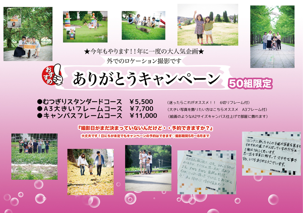| 詳細&お知らせ | 撮影体験は毎月3組 お電話または店頭にてご予約お願いいたします ※ 撮影体験モデルは当館初めてのご利用のお客様に限ります。 |